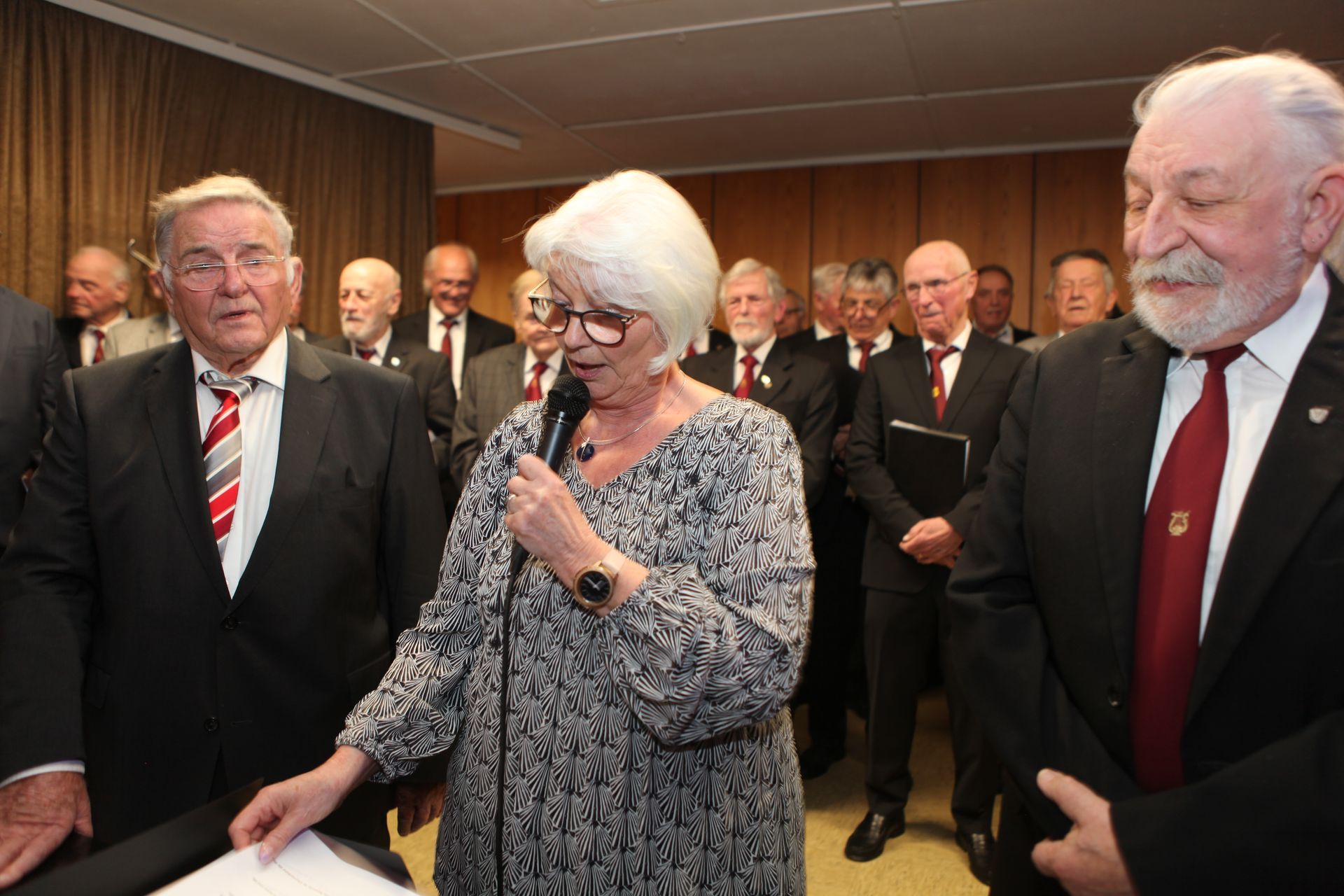 Im ersten Auftritt des Chores, unterstützt von Sängern des mit uns befreundeten Männerchores aus Honrath, wurden auch die Ehrungen von Helmut Rös für 50 Jahre und Erich Mundt für 65 Jahre Sängertätigkeit durch die Vorsitzende des Chorverbandes der Gruppe Aggertal im Deutschen Sängerbund, Frau Rita Peters, durchgeführt.
